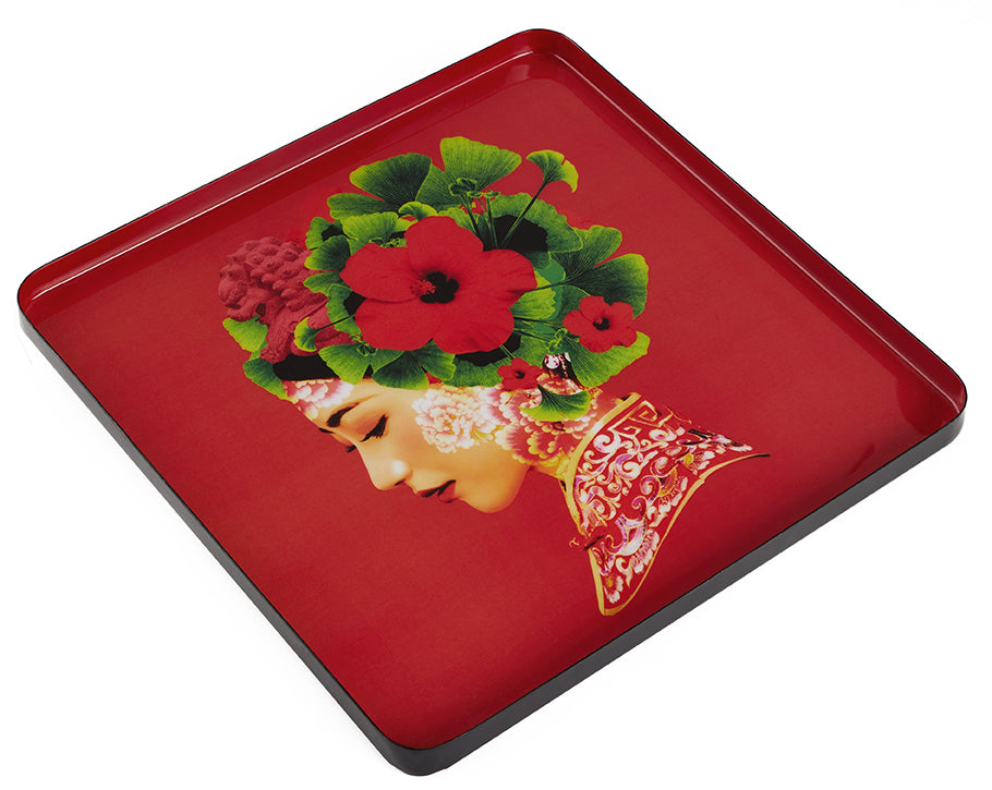 This exquisite decorative tray is a homage to the timeless beauty of Chinese artistry. A resplendent woman, adorned in a vibrant red qipao and crowned with a delicate lotus blossom, graces the tray’s surface. Her serene expression and graceful posture evoke the tranquility of a lotus pond, bringing a touch of Oriental opulence to any space.