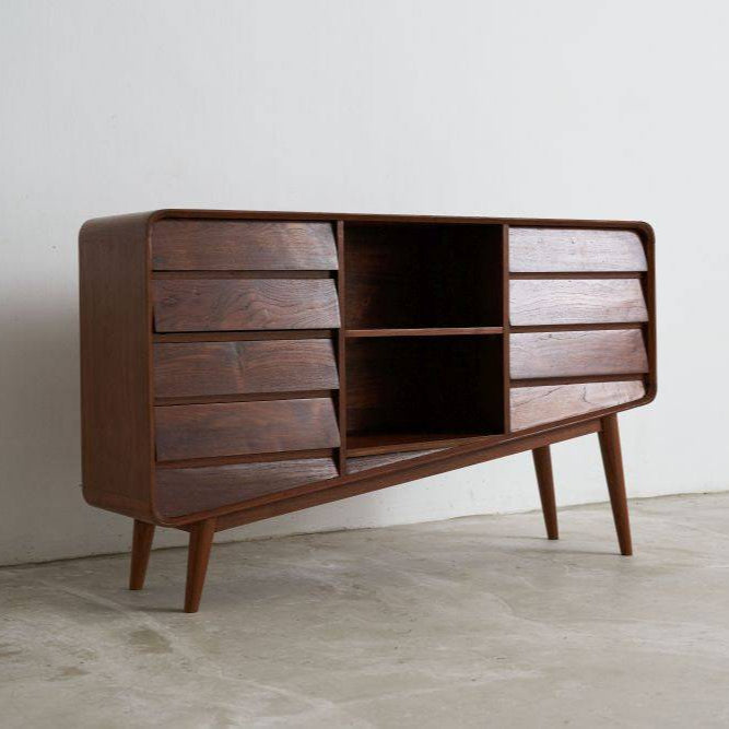 Discover the stunning Midcentury Modern Slanted Sideboard, a perfect blend of vintage design and handcrafted quality. This exquisite storage cabinet is crafted from matured solid Teak wood, showcasing timeless elegance and durability. Featuring seven carefully designed drawers, it provides ample storage for living room essentials or bedroom items like garments, towels, and socks.