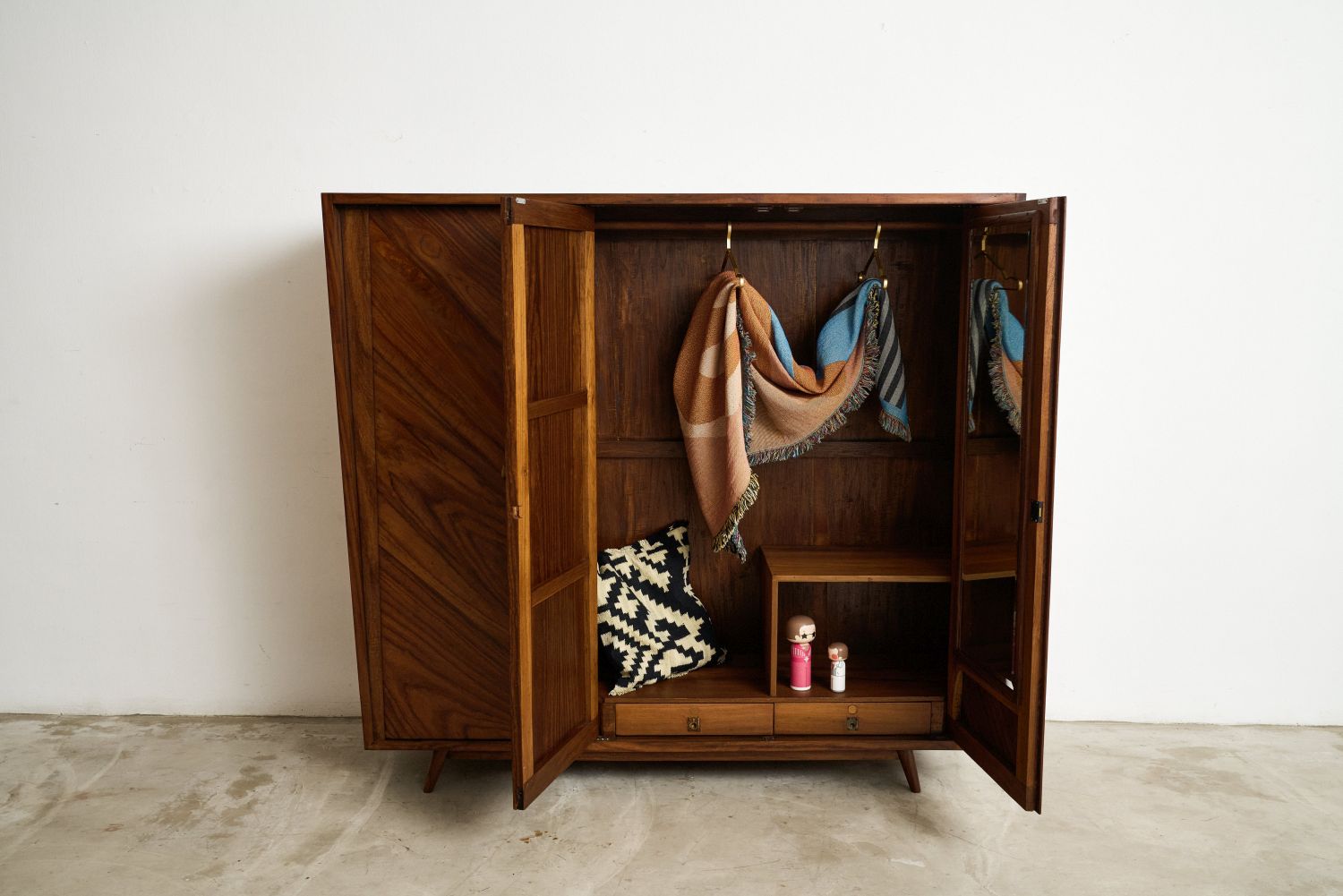Its angular trapezoid silhouette and bold geometric lines reflect the essence of Midcentury Nordic trends, while small pencil legs add a touch of lightness to its presence. The wardrobe includes a clothing rail compartment with a mirror on a swing door, a shelving compartment, and small drawers at the bottom, providing ample storage for your essentials.